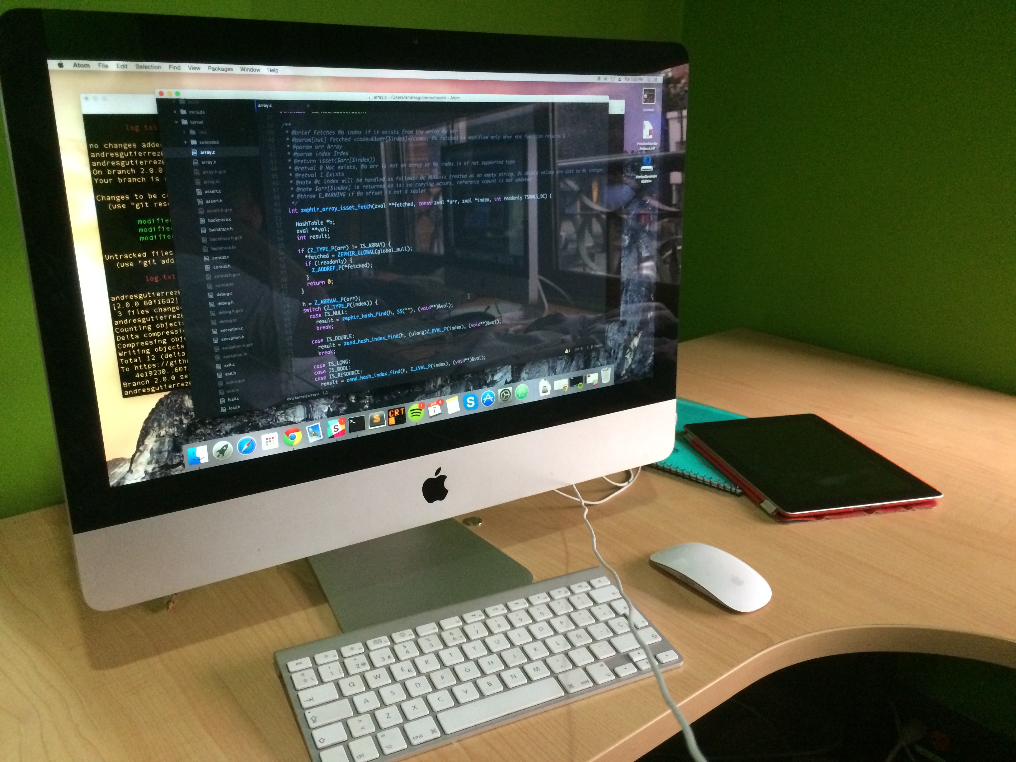 I normally work on Sublime to develop in PHP/C/Zephir, MongoDB as a database and on an iMac computer.